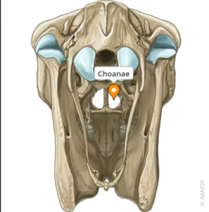 Choanal atresia occurs when the nasal passage fails to develop properly. Embryonically, the nasal passage opens from both directions. With atresia, the passages fail to meet in the middle, leaving an obstruction. One or both nostrils have a membrane that covers the oropharynx and prevents airflow. The membrane are located at the choanae- openings at the back of the nasal cavity leading to the pharynx. This means airflow does not reach the trachea from the nostril(s). If unilateral, symptoms are mild until the animals is older and/or exercising. If bilateral, it means a quick death for foals and respiratory distress for camelids.
