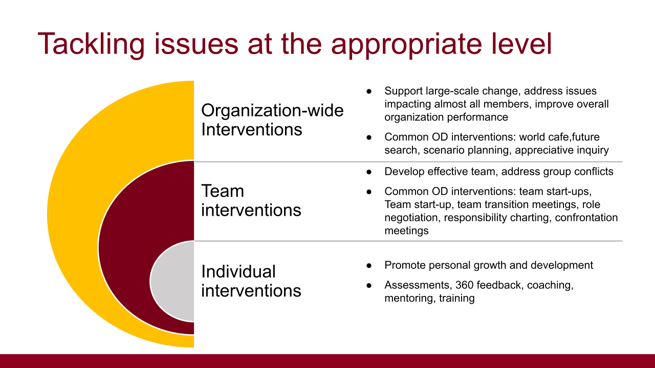 When considering which interventions to include in a plan, an essential first step is to situate the main issues at different organizational levels. As there are different OD interventions that can support individuals, teams, and the organizational system in developing and changing, it is crucial to ensure a holistic plan that can tackle issues and opportunities for change at the different levels of the organization. Figure 1. Provides an overview of common issues and well-known OD interventions at different levels of the organization. Some of these interventions are explained in more detail in Chapter 8.